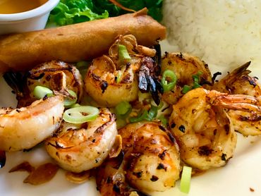 Grilled prawns, chicken, beef, and crushed peanuts on a bed of fine vermicelli noodles. Served with Rice Paper for wrapping, sprouts, lettuce, and cucumber with traditional vinaigrette